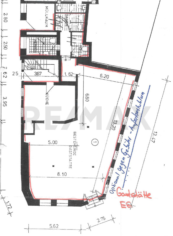 Im UG: 1 Kellerraum mit Schräg Lastenaufzug für WarenlieferungIm EG: Gastraum mit Theke und Nebenzimmer mit ca. 60-70 Sitzplätzen, 40-50 Sitzplätze im Aussenbereich Vollküche mit Tageskühlraum, Person, Damen und Herren WC