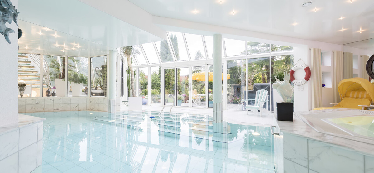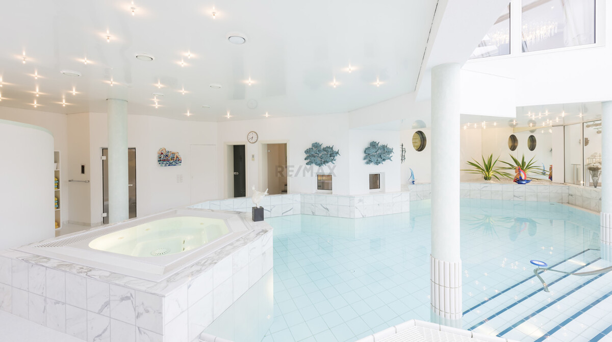 - Großer Pool mit Gegenstromanlage, separater Whirlpool und Dampfbad