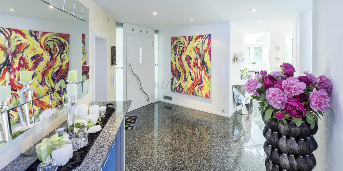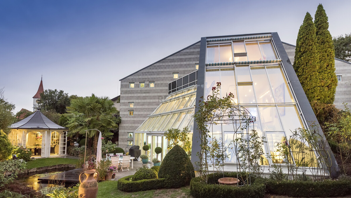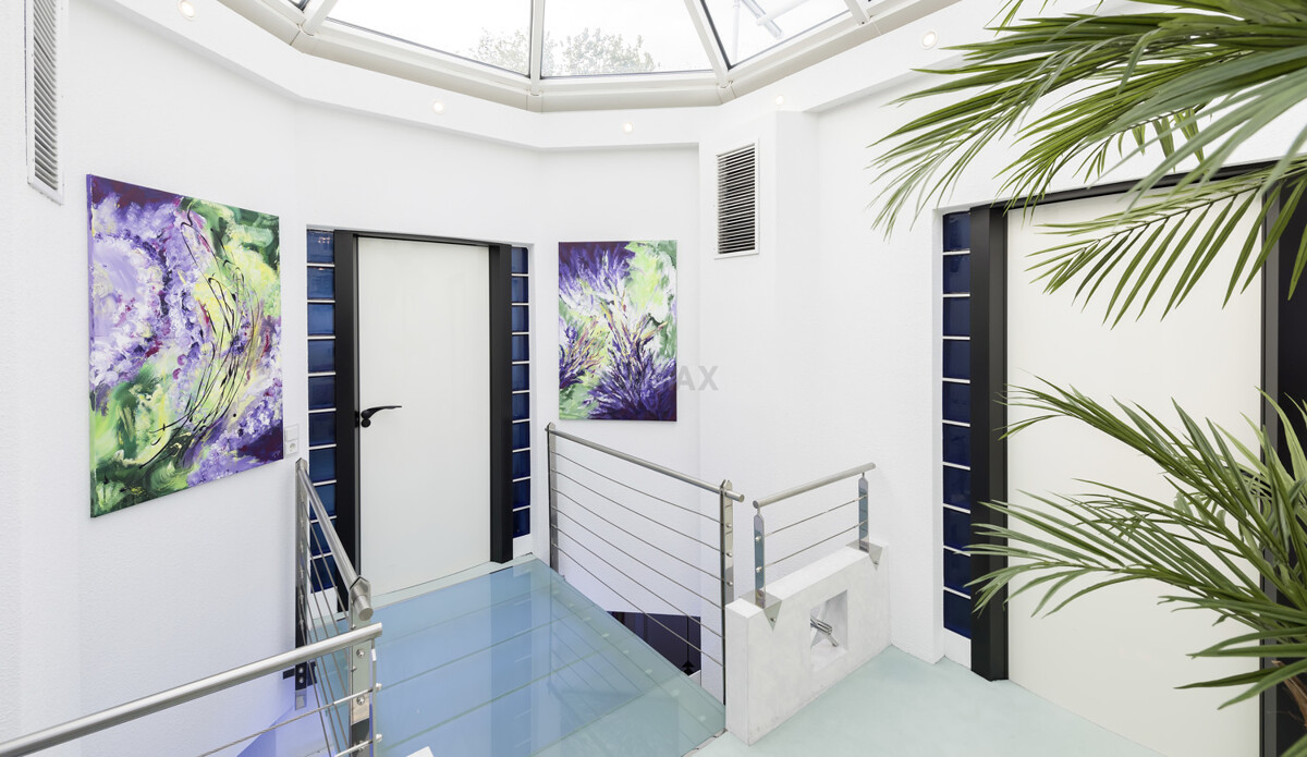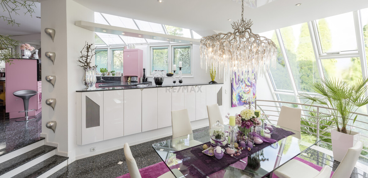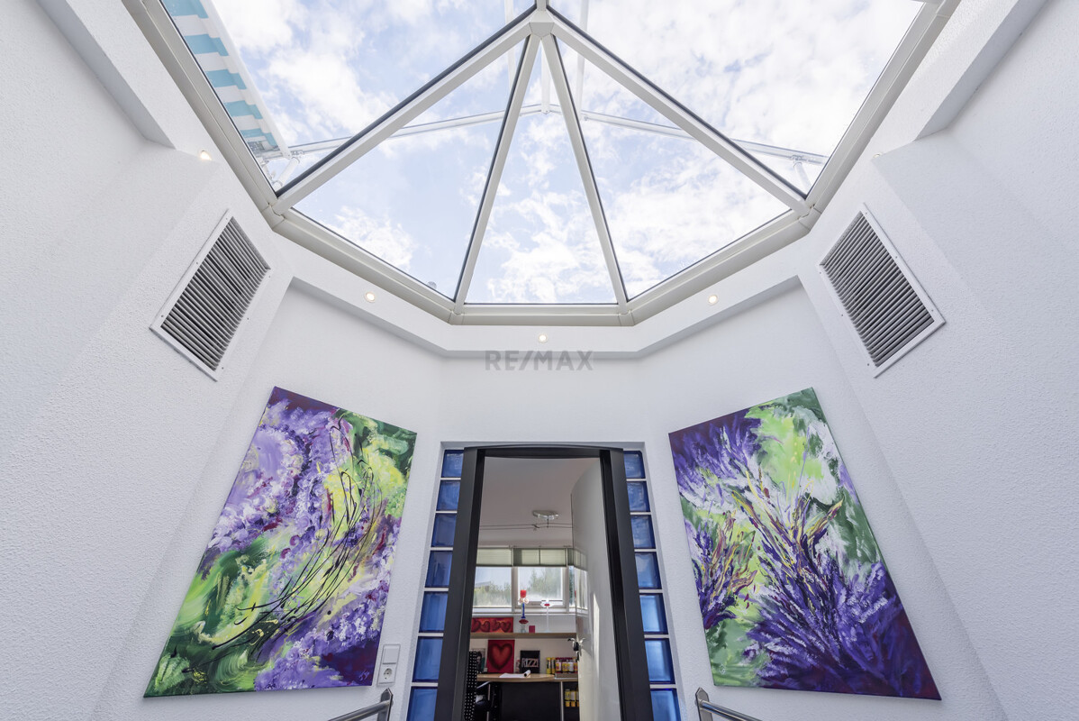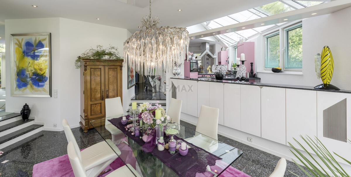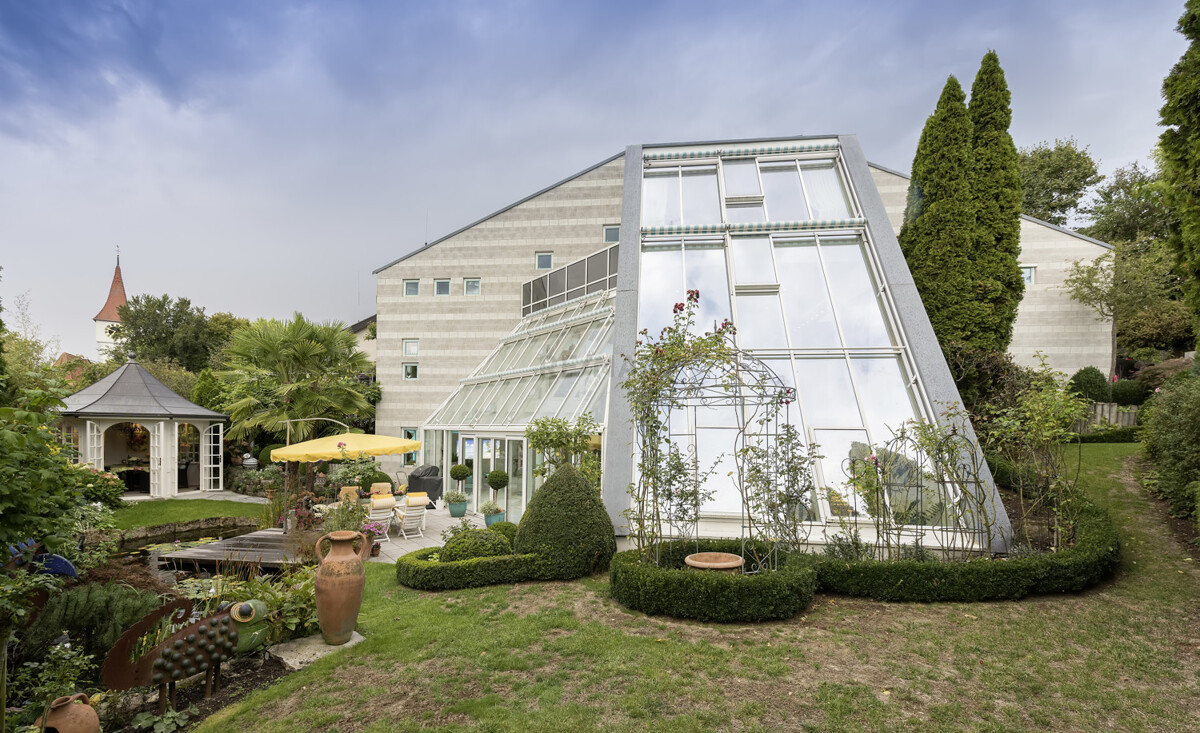Willkommen in Ihrem neuen Traumhaus! Diese beeindruckende Villa in Aichtal, genauer gesagt im charmanten Ortsteil Aich, bietet Ihnen eine luxuriöse Wohnfläche von 439 m², aufgeteilt auf drei Etagen. Hier erwartet Sie alles, was Sie sich von Ihrem neuen Zuhause erträumen.Große Glasflächen und eine verglaste Dachkuppel bringen sehr viel Tageslicht in das gesamte Haus. Gebaut im Jahr 1992, besticht das Haus durch seine außergewöhnliche Architektur, die zeitlose Eleganz und modernen Wohnkomfort perfekt vereint. Dank der klugen architektonischen Planung ist die Villa so in das Grundstück integriert, dass Sie von allen Bereichen einen freien und unverbaubaren Weitblick genießen aber Ihr Garten dennoch von außen nicht einsehbar ist.