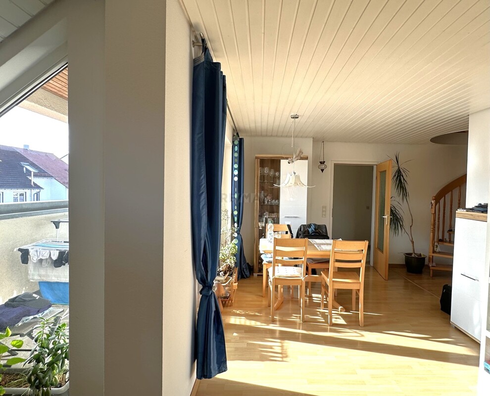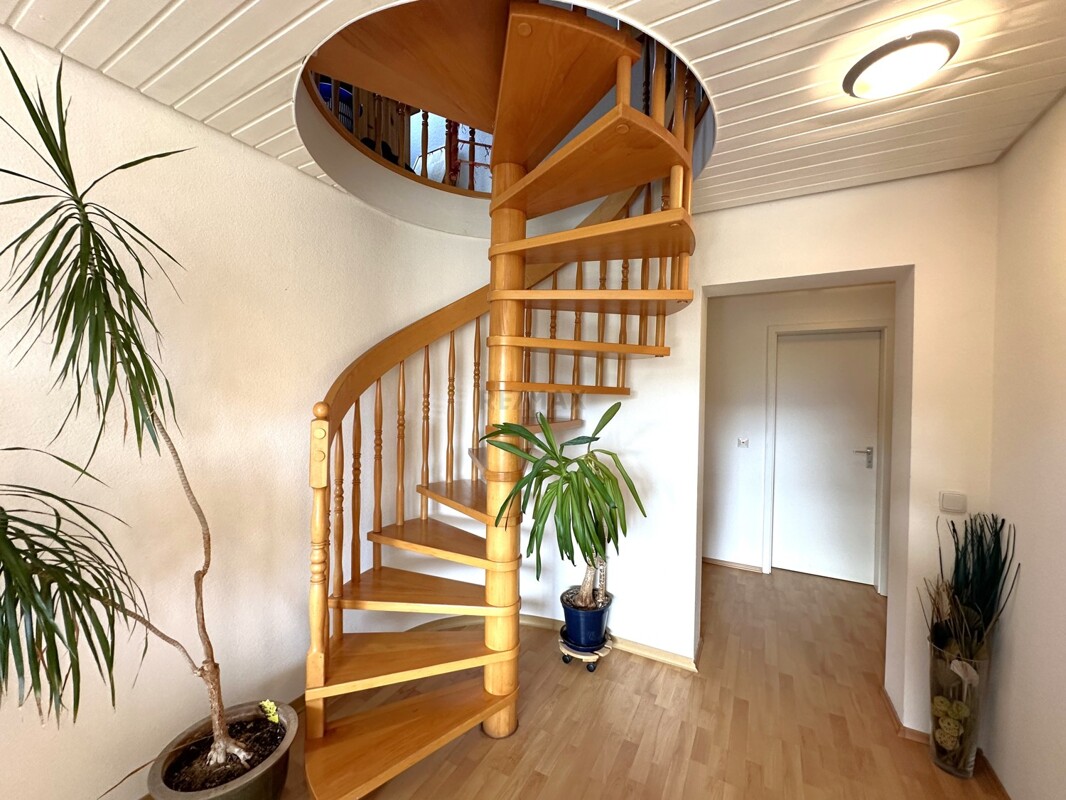 Im Wohn- Esszimmer gelangen Sie über eine stilvolle Wendeltreppe in die offene Galerie, die als Büro, Gästezimmer, Atelier oder einfach als Rückzugsort genutzt werden kann. Dieser Bereich verleiht der Wohnung eine besondere Leichtigkeit und lädt zum kreativen Entfalten ein.