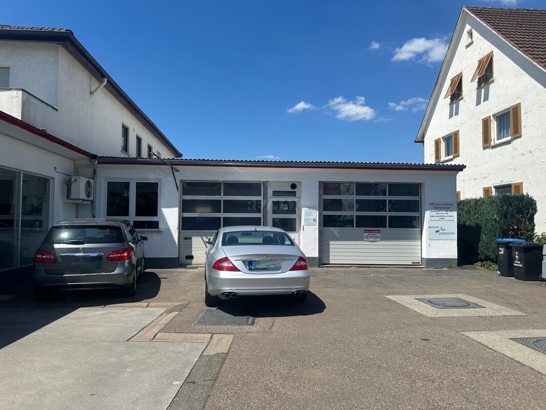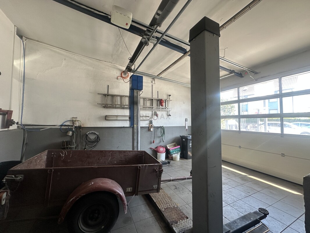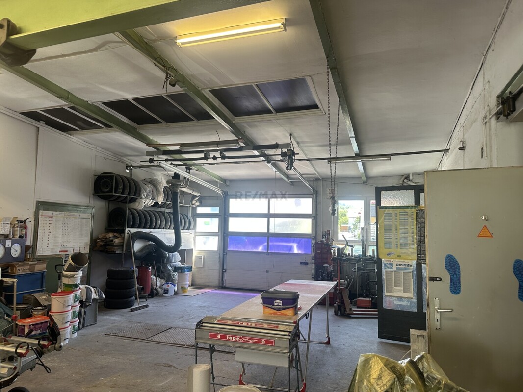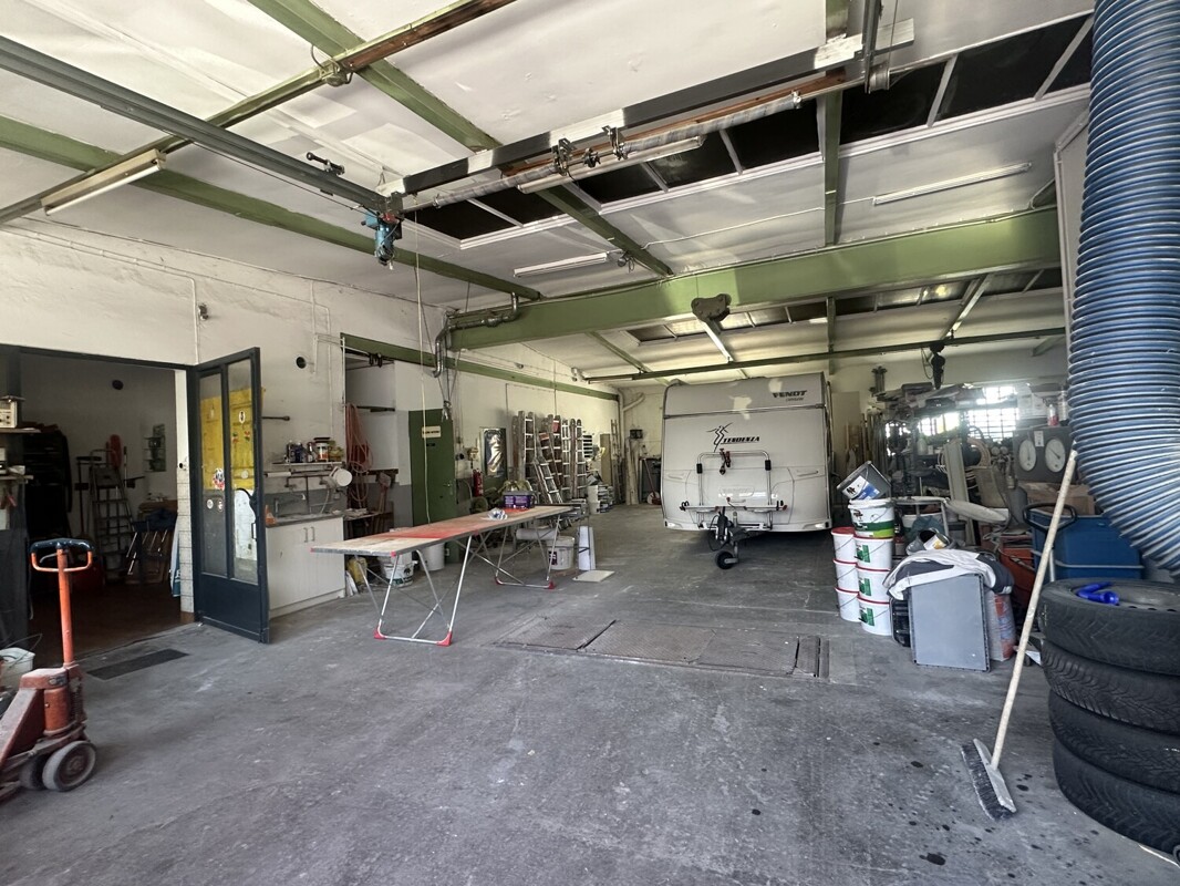 Zwei elektrische Sektionaltore sind der Eingang zur Werkstatthalle. Die Werkstatt mit Lager, Laden und WC und ehemaliger Waschhalle hat eine Nutzfläche von ca. 264m².