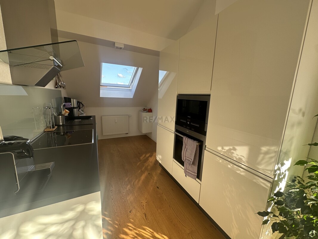 Der großzügige Wohn- und Essbereich mit moderner Küche, angrenzendem Hauswirtschaftsraum und gemütlichem Kaminofen besticht durch seinen Loft-Charakter und bietet direkten Zugang zur Loggia mit herrlichem Ausblick