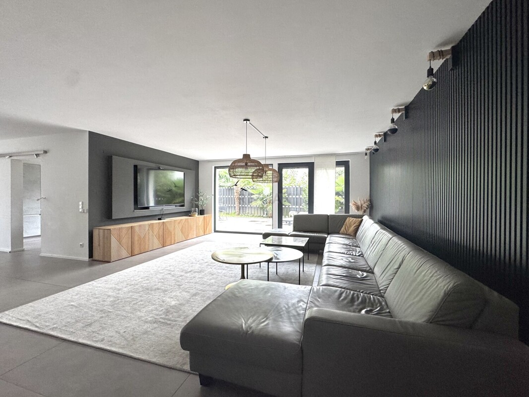 Vom Wohnzimmer aus gelangt man zur weitläufigen Terrasse mit eigenem Gartenanteil, die zum Spielen, Entspannen und gemeinsamen Beisammensein einlädt.