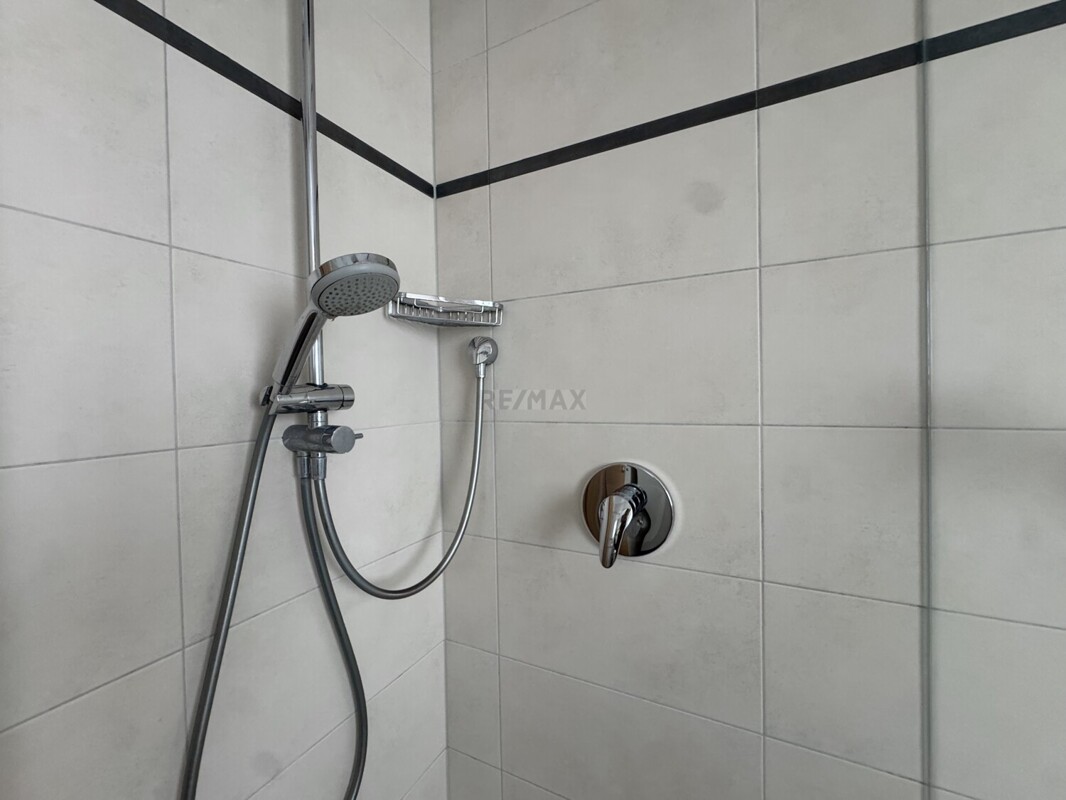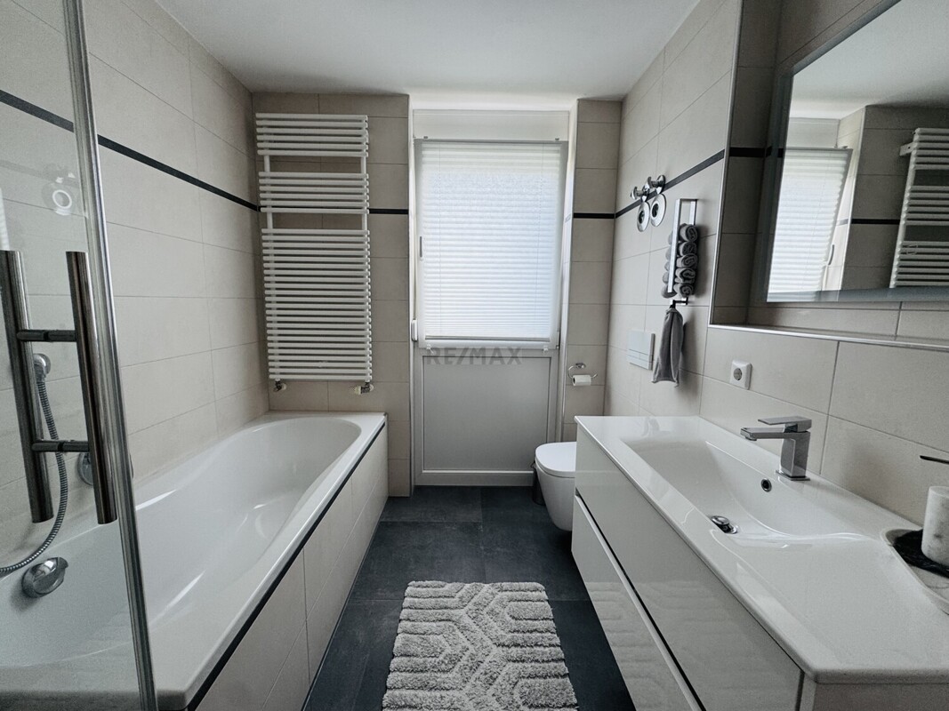 Ausgestattet mit einer Duschkabine, einer Badewanne, sowie zeitloser Fliesen, bietet es einen gepflegten Ort zum Wohlfühlen.