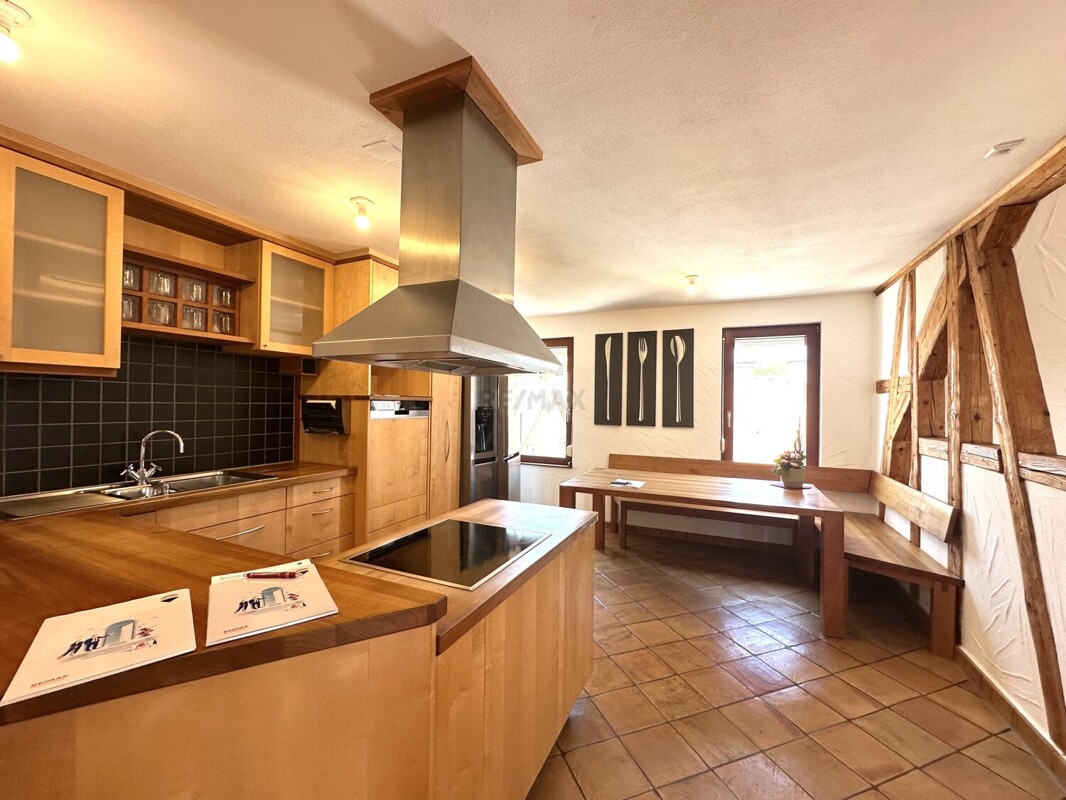 - Große Wohnküche aus Massivholz mit Tisch und Eckbank & Side-by-Side-Kühlschrank