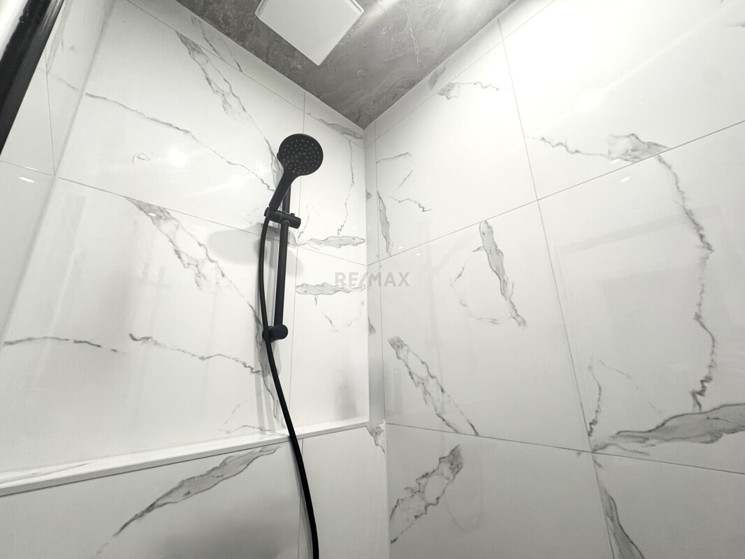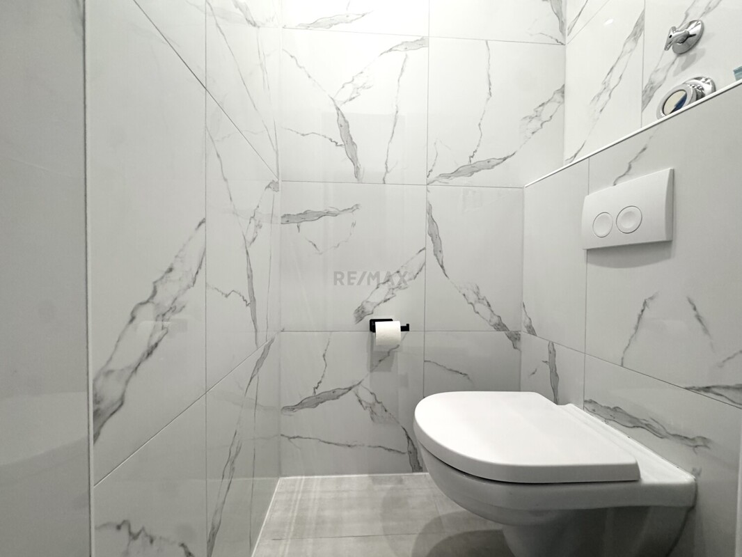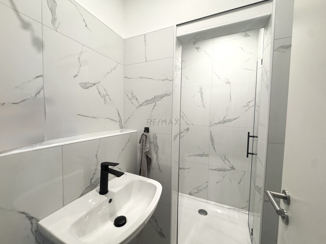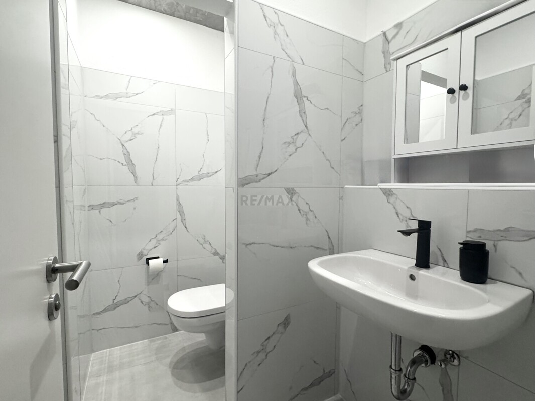 Das Badezimmer mit einer Walk-In-Dusche, sowie das separate WC, bestechen durch die durchdachte Gestaltung der eleganten Fliesen in Marmoroptik.