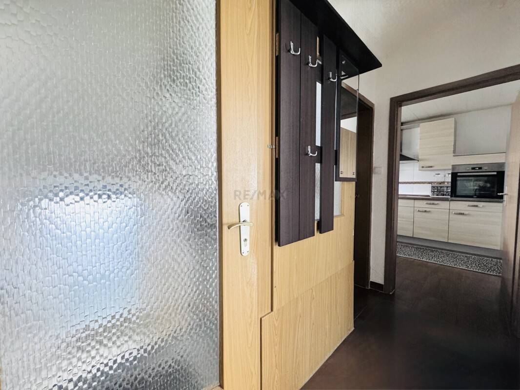 Die Raumtrennung im Eingang bestehend aus einer Glastür und Holzelementen, kann entfernt werden und schafft so einen offenen einladenden Empfangsbereich mit zusätzlichem Tageslicht.