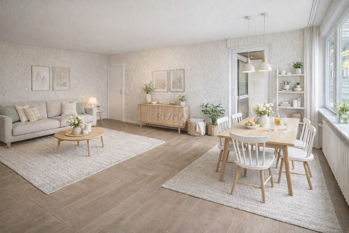 Es erwartet Sie u.a. ein großzügiger Wohn- und Essbereich, der das Herzstück der Wohnung bildet. Eine schöne Fensterfront sorgt für viel Tageslicht und schaffen eine angenehme, helle Atmosphäre. Gleichzeitig genießen Sie von hier aus einen schönen direkten Blick in den Garten, was dem Wohnraum eine besonders offene und entspannte Wirkung verleiht. Ein Flur, großes Schlafzimmer, offener Küchenbereich und Bad mit Badewanne haben ebenso Platz gefunden.