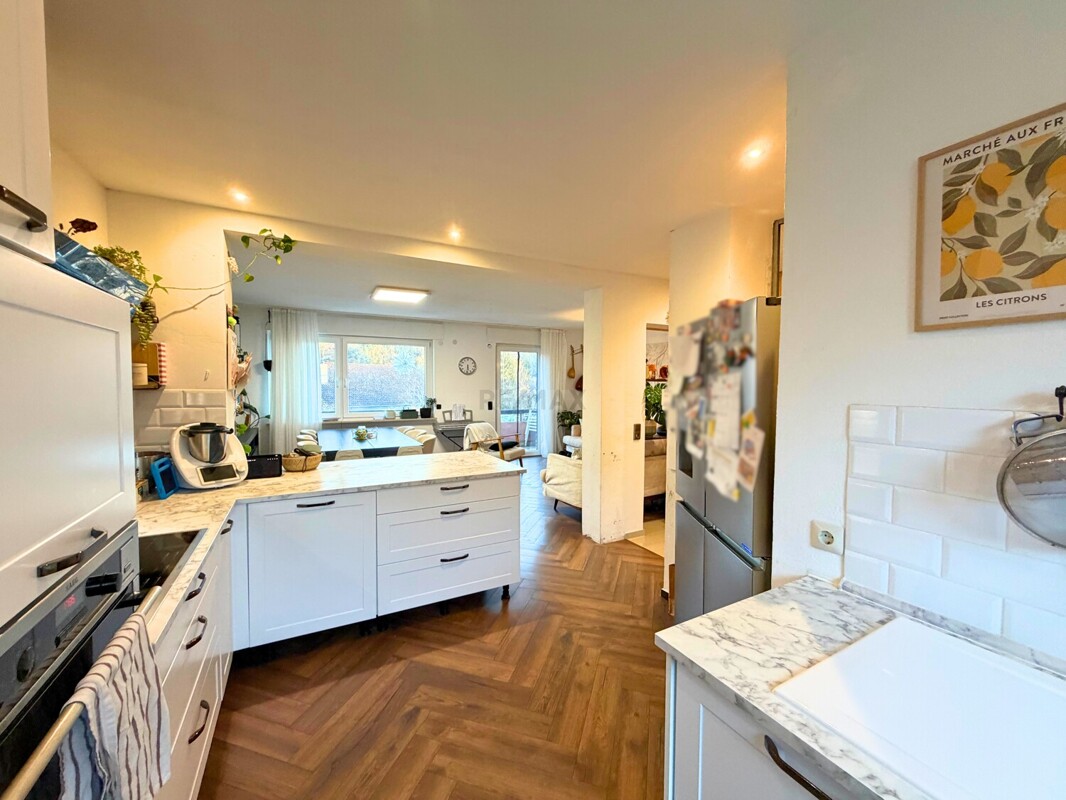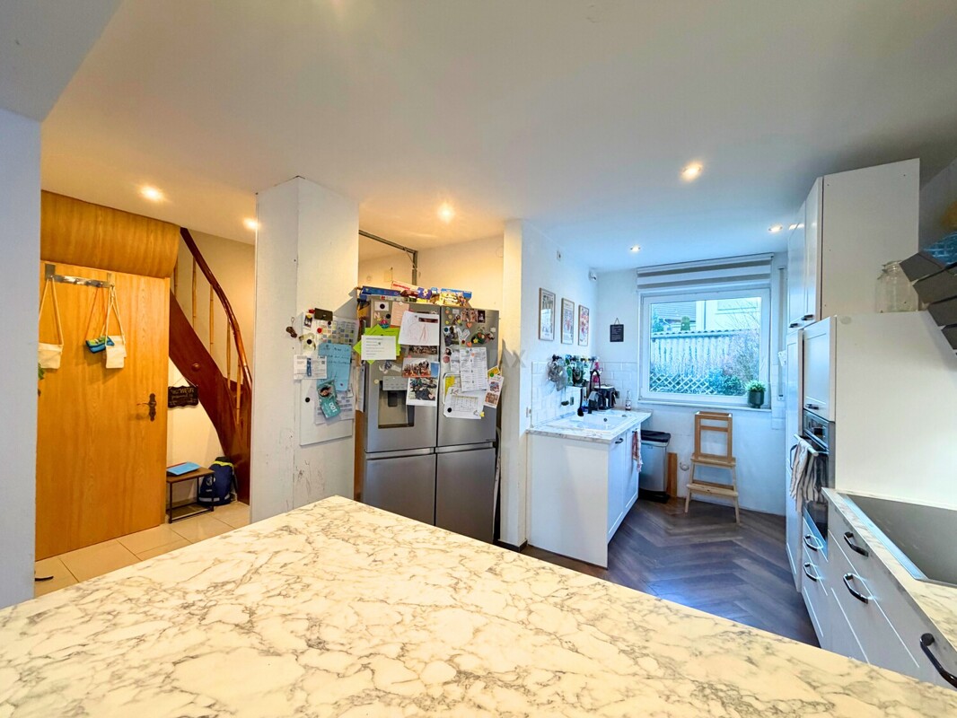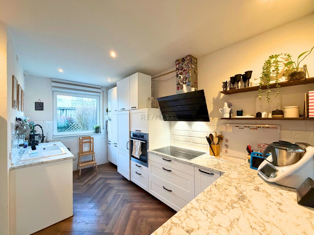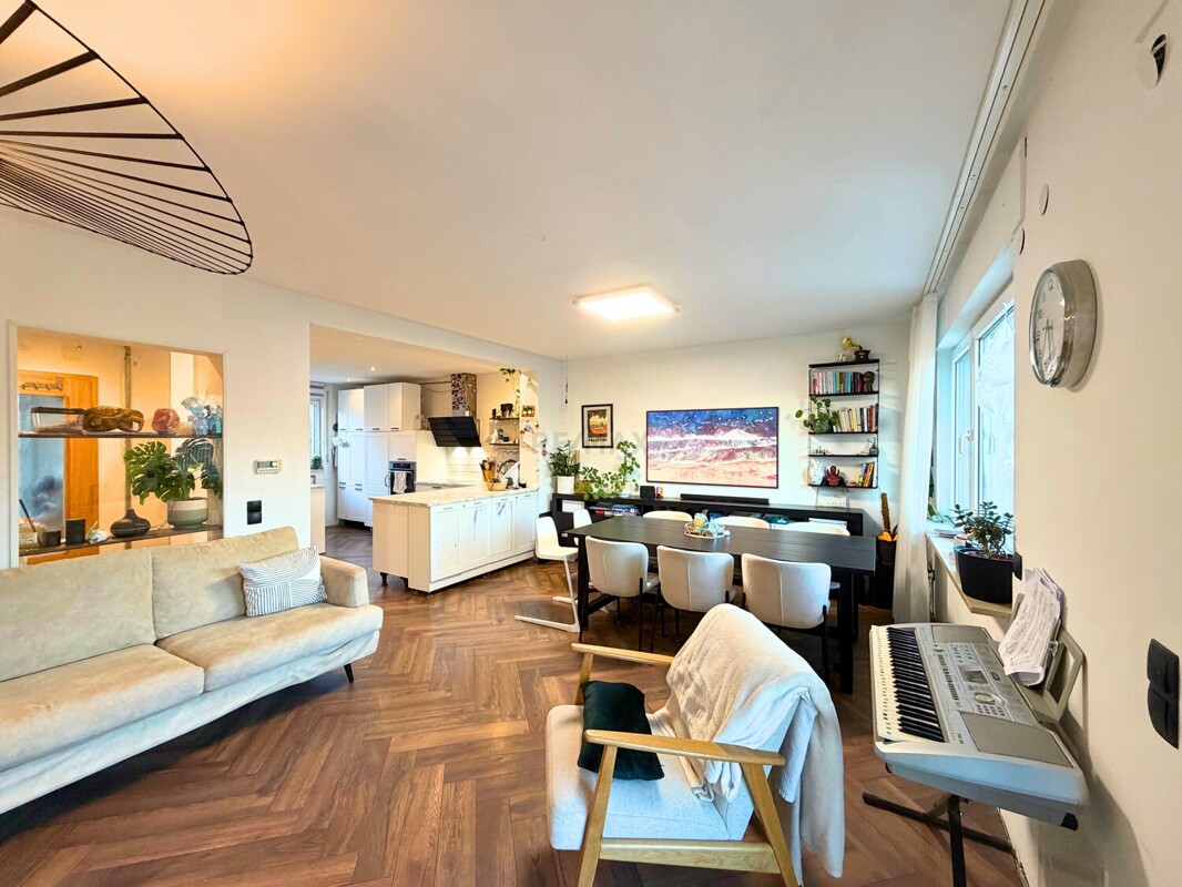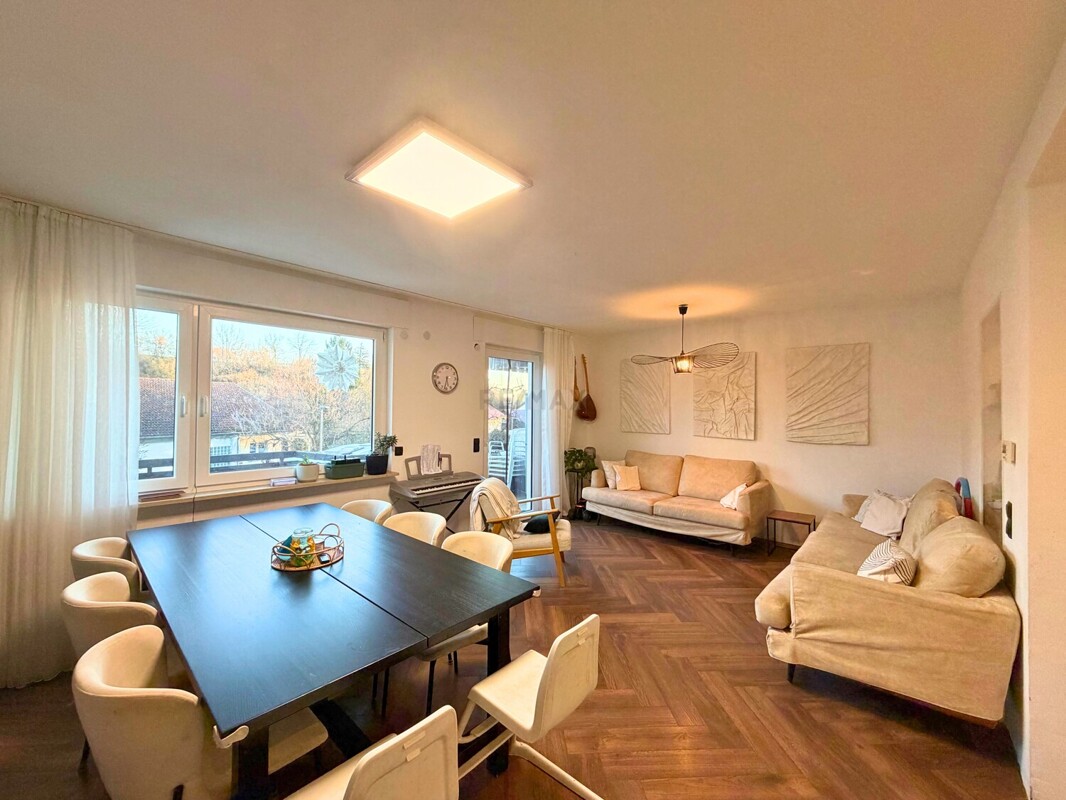 Im Inneren des Hauses erwartet Sie im Erdgeschoss ein großzügiger Wohn- und Essbereich mit offener Küche, der den zentralen Treffpunkt des Hauses bildet. Vom Wohnzimmer aus gelangen Sie direkt auf den ersten Balkon. Der Eingangsbereich verfügt über einen praktischen Windfang sowie ein Gäste-WC. Ein besonderes Highlight: Im Jahr 2022 wurde im Wohn- und Essbereich eine Fußbodenheizung installiert.