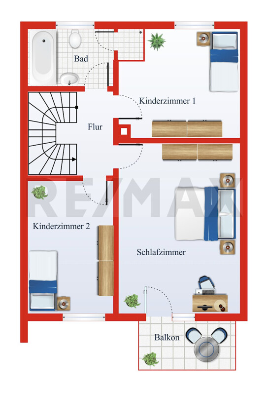 Im Obergeschoss befinden sich drei Schlafzimmer, darunter ein Schlafzimmer sowie zwei Kinderzimmer. Ergänzt wird diese Etage durch ein Tageslichtbad. Vom Elternschlafzimmer aus haben Sie außerdem Zugang zum zweiten Balkon. Zusätzlich steht ein Dachspitz zur Verfügung, der reichlich Stauraum bietet.